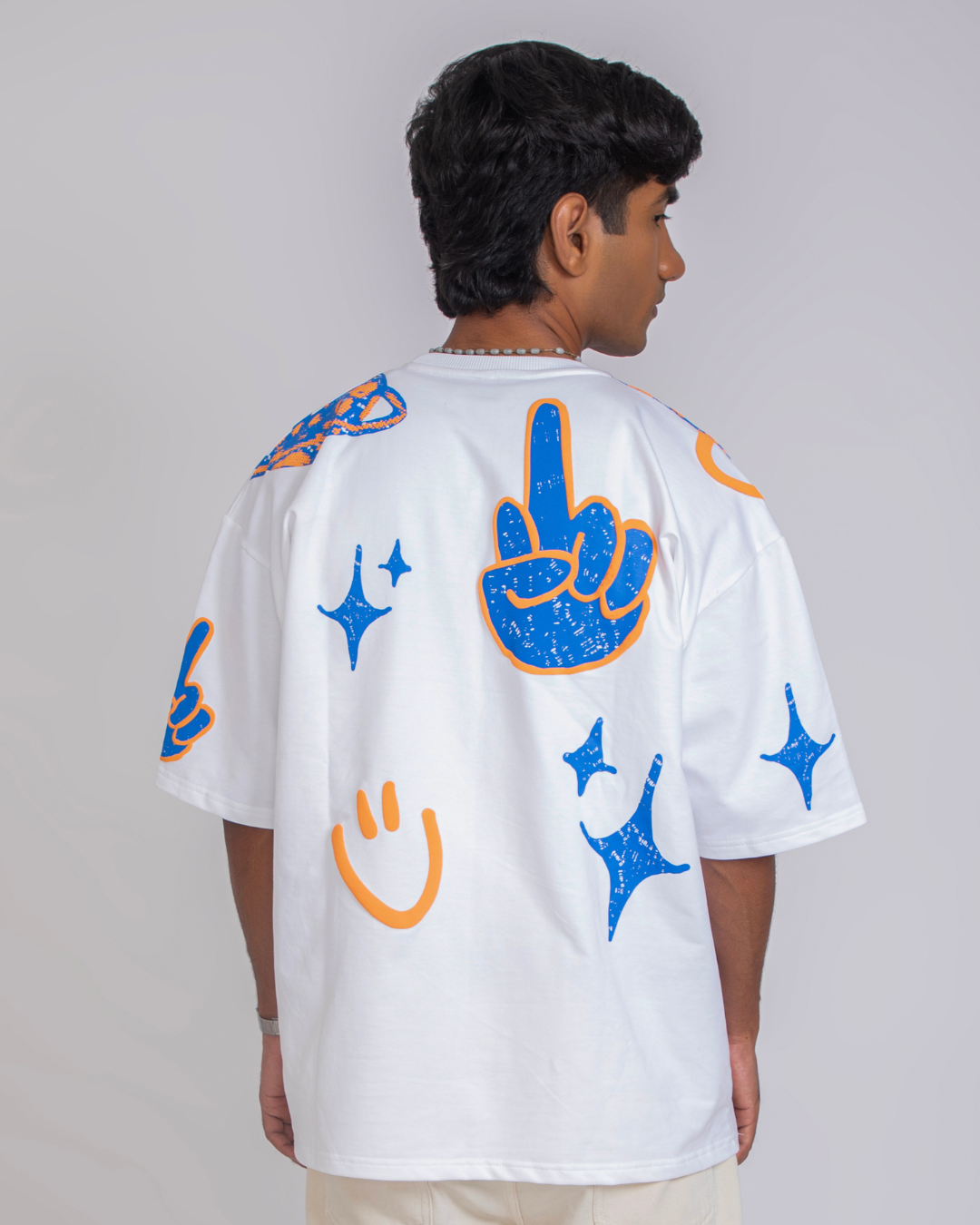 A full-volume graphic tee featuring a giant “F*CK OFF” on the front, and a chaotic mix of peace signs, stars, and smirks on the back.